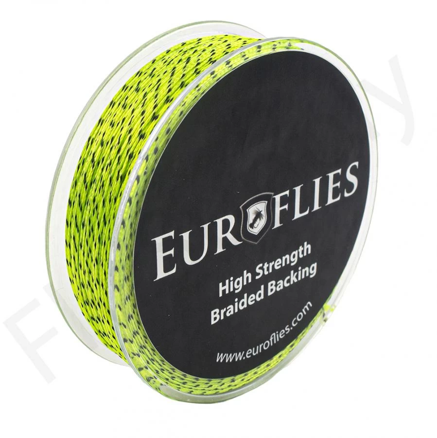 The Euro Flies High Strength Thin Backing comes in 20 or 30 lb in several bright colours, with 100 yards / 91 meters per spool.