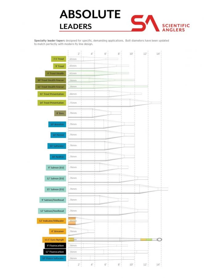 The Scientific Anglers Absolute Bonefish Leaders 10′ are made with proprietary copolymer blends that are designed to drastically reduce water absorption, while maintaining an optimal suppleness for high knot strength. The Absolute Bonefish Leaders in a length of 10’/300 cm have a 29% higher wet knot strength compared to their previous material and up to 40% higher wet knot strength when compared to that of the competitors.