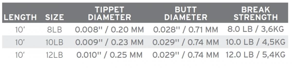 The Absolute Bonefish Leaders 10′ are available with a tippet of 8 lb/3.6 kg – 20/00, 10 lb/4.5 kg – 23/00 and 12 lb/5.4 kg – 25/00.
