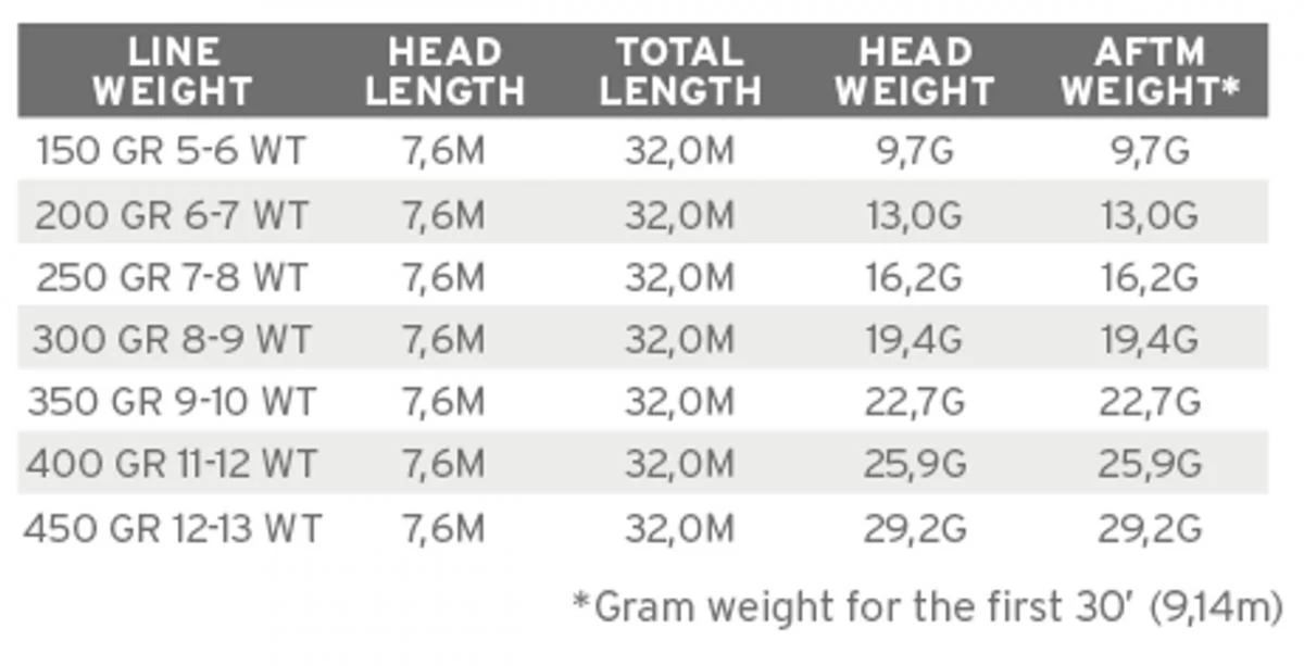 | Select | 150 grain/5-6 wt/Chartreuse-Charcoal, 200 grain/6-7 wt/Yellow-Charcoal, 250 grain/7-8 wt/White-Charcoal, 300 grain/8-9 wt/Green-Charcoal, 350 grain/9-10 wt/Orange-Charcoal |