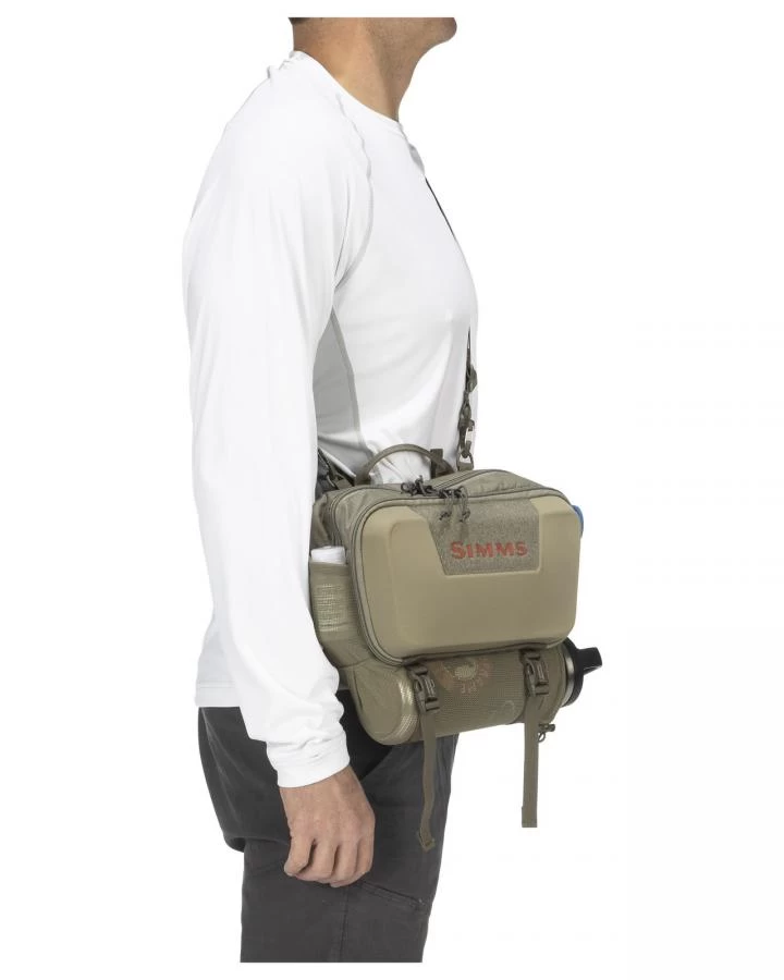 The compression-moulded Simms Flyweight Large Pod Tan conveniently docks with Flyweight carry systems or serves as a standalone hip pack for housing an arsenal of fly boxes, tippet spools, tools and more.